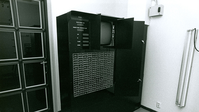 Ääntenlaskukone puhemiehen aitiossa vuodelta 1931. ​Kuva: Aarne Pietinen / Historian kuvakokoelma / Museovirasto.​​​​​​​