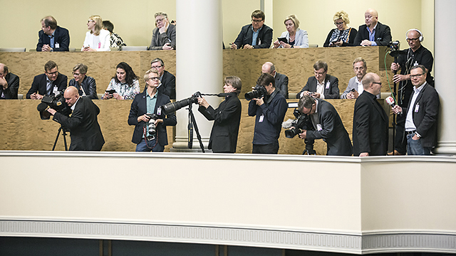 Akkreditoiduille toimittajille ja kuvaajille on järjestetty työtiloja Eduskuntatalossa. He saavat tunnistamista helpottavan kuvallisen toimittajakortin.
