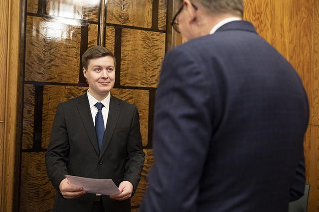 Tuomas Kettunen esitti valtakirjansa puhemies Matti Vanhaselle puhemiehen työhuoneessa 28.11.2019
