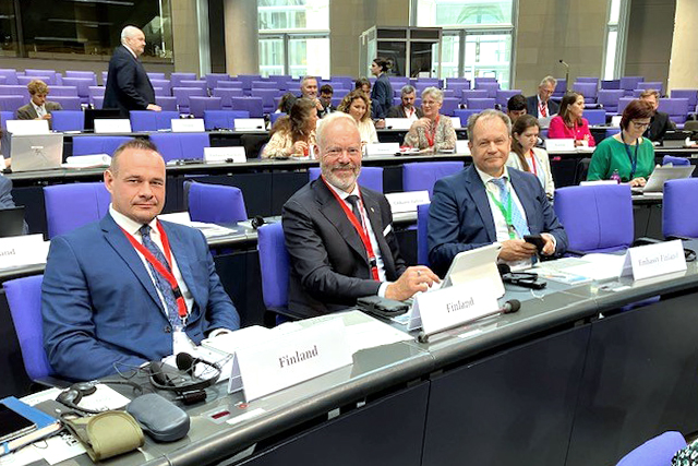 ​Suomen Itämeri-valtuuskunnan varapuheenjohtaja Mikko Polvinen (vasemmalla) ja kansanedustaja Pauli Aalto-Setälä (keskellä) Berliinin Itämeri-konferenssissa.