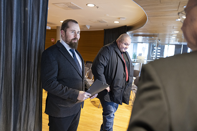 Aloitteen luovuttivat Paavo Väisänen (kuvassa vasemmalla) ja Jarkko Laukkanen. Kuvassa selin aloitteen vastaanottanut istuntoyksikön päällikkö Antti Linna.