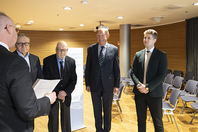 Kansalaisaloitetta luovuttamassa oikealta Henri Vanhanen, Juhani Kaskeala, Jaakko Iloniemi ja Hannu Himanen. Vasemmalla istuntoyksikön päällikkö Antti Linna, joka otti aloitteen vastaan.​​