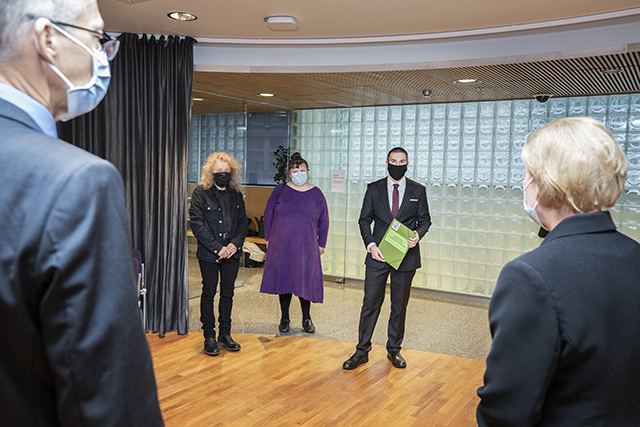 ​Timo Larmela, Elina Kukinto ja Lauri Louhio luovuttivat kansalaisaloitteen eduskunnalle. Kuvassa selin apulaispääsihteeri Timo Tuovinen ja lainsäädäntöjohtaja Tuula Kulovesi.