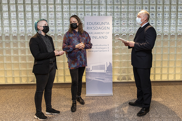 Kansalaisaloitteen luovuttivat Valo Vesikauris (vasemmalla) ja Panda Eriksson (oikealla). Aloitteen vastaanotti eduskunnan puolesta istuntoyksikön päällikkö Antti Linna.