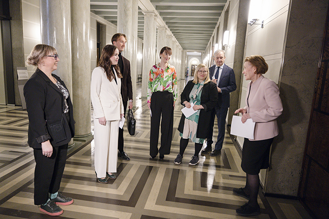 Kuvassa vasemmalta Aino-Kaisa Pekonen (vas.), Hilkka Kemppi (kesk.), Ilmari Nurminen (sd.), Eveliina Heinäluoma (sd.), Saara Hyrkkö (vihr.) ja Harry Harkimo (liik.). Välikysymyksen vastaanotti lainsäädäntöjohtaja Tuula Kulovesi.