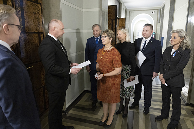 Välikysymyksen luovuttivat Peter Östman (kd.) (selin), Sari Essayah (kd.), Harry Harkimo (liik.), Riikka Purra (ps), Janne Heikkinen (kok) ja Ritva Elomaa (ps.). Vastaanottajana oli eduskunnan istuntoyksikön päällikkö Antti Linna.