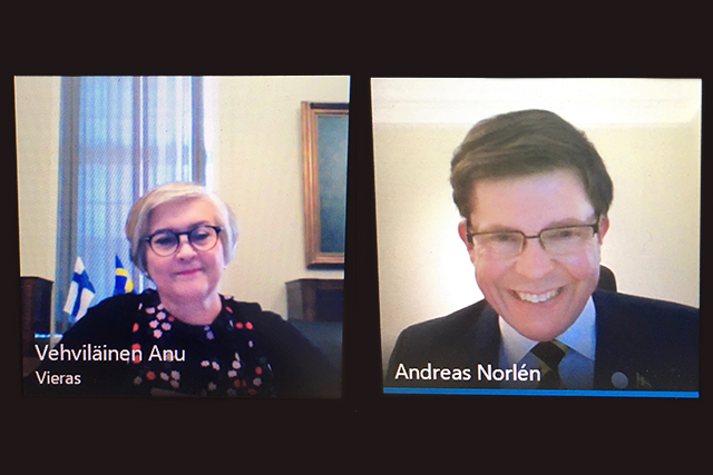 "Olemme päässeet takaisin normaalimpaan poliittiseen keskusteluun ja eduskunnan käsittelyssä on muitakin kuin koronaan liittyviä lakiehdotuksia", Vehviläinen totesi Ruotsin kollegalleen.