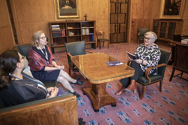 Valtiontalouden tarkastusviraston (VTV) ylijohtaja Tytti Yli-Viikari ja vaikuttavuusjohtaja Anna-Liisa Pasanen luovuttivat puhemies Anu Vehviläiselle VTV:n vuosikertomuksen torstaina 17. syyskuuta 2020.