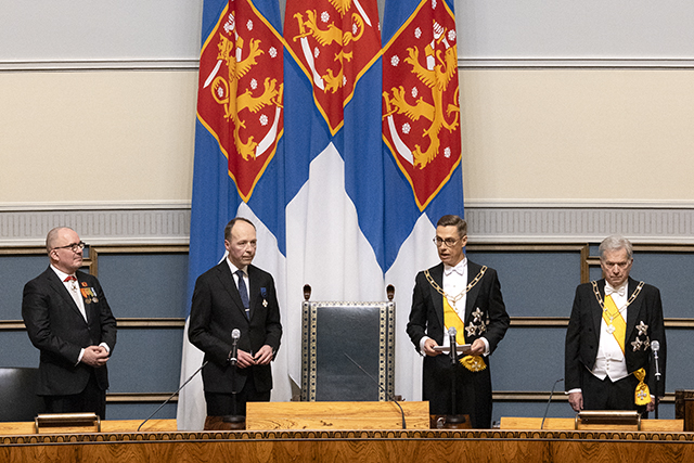 Puheiden jälkeen toimessa aloittava tasavallan presidentti Alexander Stubb antoi Suomen perustuslain 56 §:ssä säädetyn juhlallisen vakuutuksen ja piti puheen eduskunnalle.