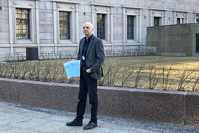 Eduskunnan kirjaston johtaja Antti Virrankoski vie vasta valmistunutta kirjaston kertomusta eduskunnan istuntoyksikköön.