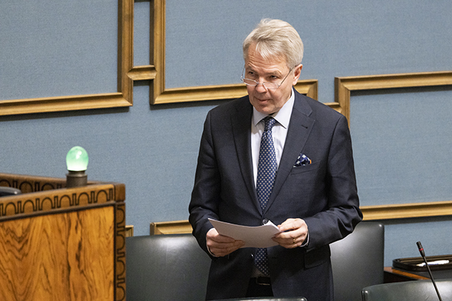 Ulkoministeri Pekka Haavisto (vihr.) esitteli selonteon eduskunnalle.