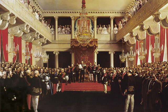 Valtiopäivien avajaiset 1863. R. W. Ekman: Keisari Aleksanteri II avaa säätyvaltiopäivät keisarillisen palatsin Valtaistuinsalissa 1863. Kuva: Markku Haverinen / Museovirasto CC BY 4.0.