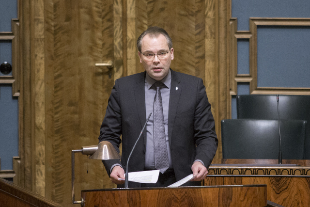 ​Puolustusministeri Jussi Niinistö (sin.) täysistunnossa 4.12.2018