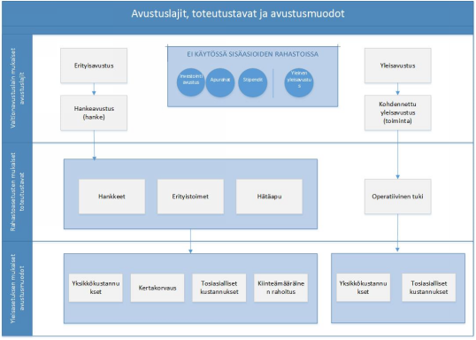 Yleisasetuksessa säädetään avustusmuodoista ja niitä koskevista tarkemmista säännöistä. Jäsenvaltiolle on annettu harkintavaltaa sen osalta, millaisia avustusmuotoja kansallisesti otetaan käyttöön. Sovellettavista avustusmuodoista säädetään kansallisessa laissa.