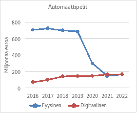 Ehdotetun pykälän 12 kohta sisältäisi rahapeliautomaatin määritelmän. Arpajaislain 3 §:n 2 momentin 4 kohta sisältää raha-automaatin määritelmän. Voimassa olevaan lakiin nähden kohdassa tarkoitetun peliautomaatin tai laitteen määritelmää muutettaisiin toimeenpanomuodon nimikkeen osalta. Yleiskielisessä merkityksessä raha-automaatti voidaan terminä kokea harhaanjohtavaksi (vrt. rahannostoautomaatti) ja toimeenpanomuodon nimike muutettaisiin vastaamaan paremmin yleiskielistä ilmaisua. Rahapeliautomaatit ovat nykyisin tyypillisesti kosketusnäytöllisiä laitteita, joissa voi olla laajakin rahapelipelivalikoima. Automaateissa voi olla myös mekaanisia elementtejä, kuten arvontakiekkoja tai painikkeita. Nykyisissä rahapeliautomaateissa arvonta perustuu laitteessa olevan mikrosirun tai ulkopuolisen palvelimen suorittamaan arvontaan pelihetkellä, jolloin arvonta perustuu tilastolliseen algoritmiin. Arvonta voi perustua myös mekaanisen arvontalaitteen suorittamaan arvontaan. Automaateille on ominaista, että niitä pelataan pelikasinolla olevia automaatteja lukuun ottamatta suhteellisen pienillä panoksilla ja niistä voi voittaa suhteellisen pieniä rahavoittoja. Nykykäytännön mukaisesti pelaaja voisi saada rahapeliautomaatista voittona paperisen voittotositteen käteisen sijaan. Rahapeliautomaattiin voidaan yhdistää myös jackpot-voittoja, jotka toimivat erilliseltä palvelimelta. Oma rahapeliautomaattien peliryhmänsä on automatisoidut pöytäpelit, jotka ovat pöytäpelien automaattisia sovelluksia, joissa pelaajat pelaavat joko pelinjärjestäjää tai toisiaan vastaan. Näissä peleissä pelaaja osallistuu peliin käyttämällä rahapeliautomaattia ja pystyy seuraamaan pelin kulkua laitteen näyttöpaneelista tai mekaanisesta arvontalaitteesta.
