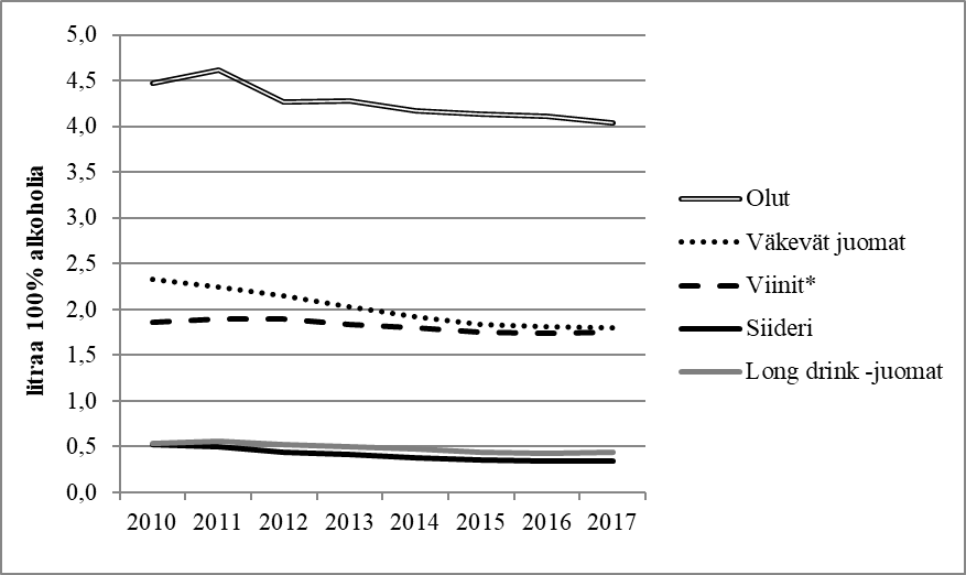 Alkoholijuomien kokonaiskulutus on ollut Suomessa laskussa 2010-luvulla. Kokonaiskulutuksen lasku on useimpina vuosina johtunut tilastoidun kulutuksen eli kotimaassa myytyjen ja verotettujen juomien kulutuksen vähenemisestä. Vuonna 2017 alkoholin kokonaiskulutuksen runsaan neljän prosentin vähenemä johtui kuitenkin etenkin tilastoimattoman kulutuksen vähenemästä, sillä alkoholin tilastoitu kulutus väheni 0,8 prosenttia ja tilastoimaton kulutus 17,4 prosenttia. Kokonaiskulutuksen määrä oli 10,3 litraa sataprosenttista alkoholia yli 15 vuotta täyttänyttä asukasta kohden.