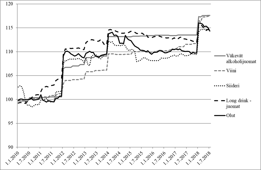 Alkoholijuomien vähittäismyyntihinnat ovat Tilastokeskuksen kuluttajahintaindeksin mukaan vuoden 2014 alun veronkorotuksen ja vuoden 2017 lopun välisenä ajanjaksona joko laskeneet tai nousseet enintään inflaatiokehityksen mukaisesti. Oluen hinnat ovat keskimäärin laskeneet vajaa neljä prosenttia. Viinien hinnat ovat nousseet noin kaksi prosenttia, kun taas siiderin ja long drink -juomien hinnat ovat laskeneet yli kaksi prosenttia. Väkevien hintataso oli vuoden 2017 lopussa suurin piirtein vuoden 2014 alun tasolla. Yleisesti hinnat ovat nousseet samana ajanjaksona 1,8 prosenttia, joten reaalisesti alkoholijuomien vähittäismyyntihinnat ovat laskeneet vuosien 2014 alun ja 2017 lopun välillä.