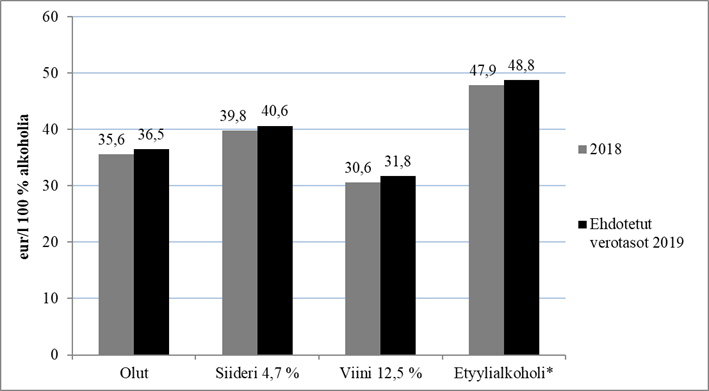 Laskelmat perustuvat seuraaviin oluen ja kuohumattoman viinin alkoholipitoisuuksiin: olut 5 tilavuusprosenttia ja viini 12,5 tilavuusprosenttia alkoholia.