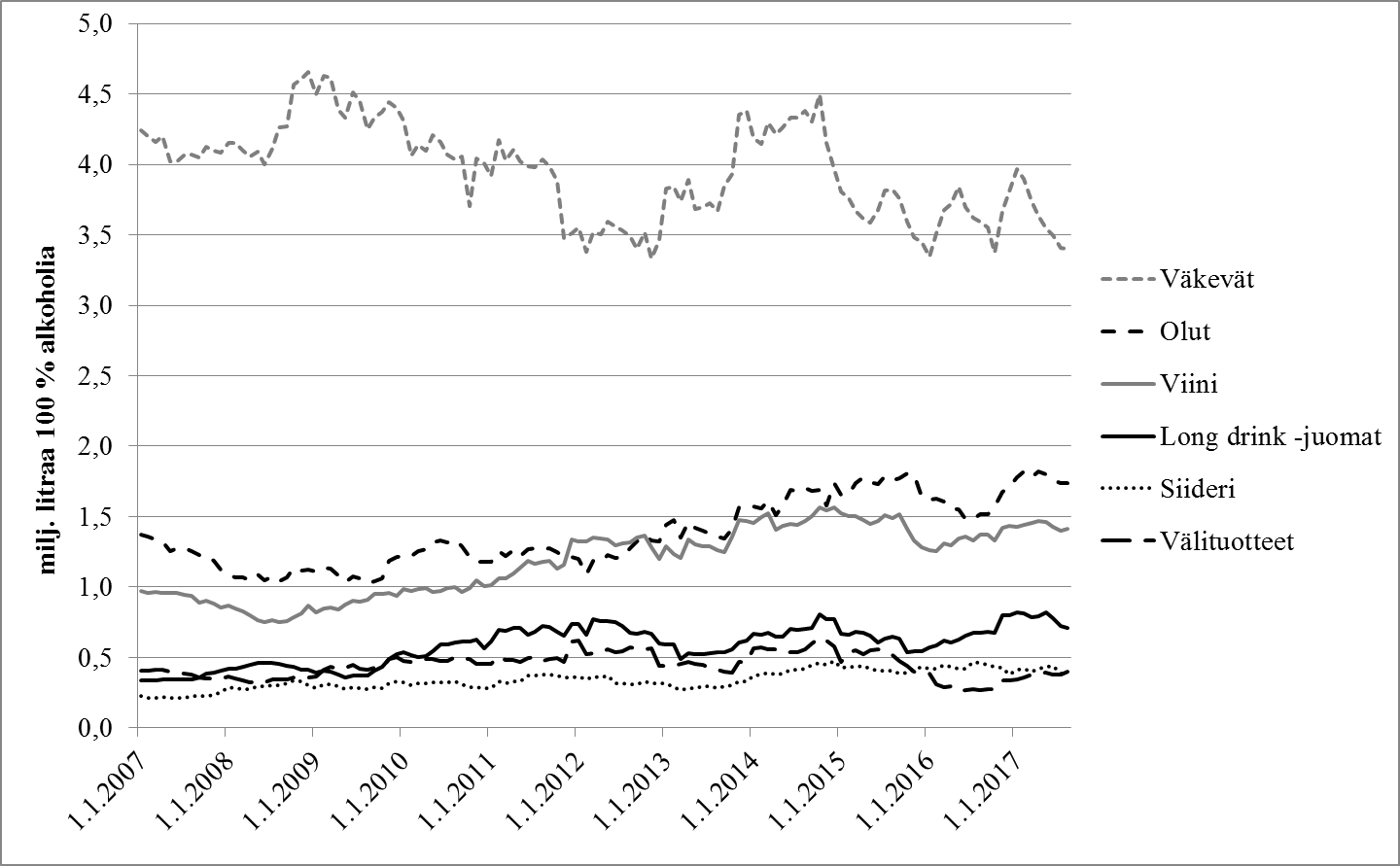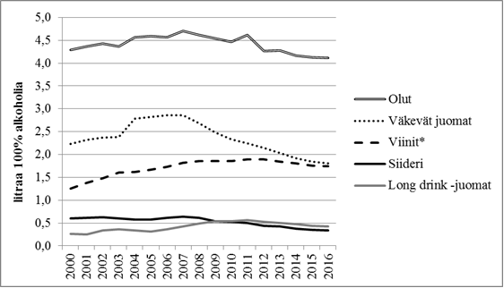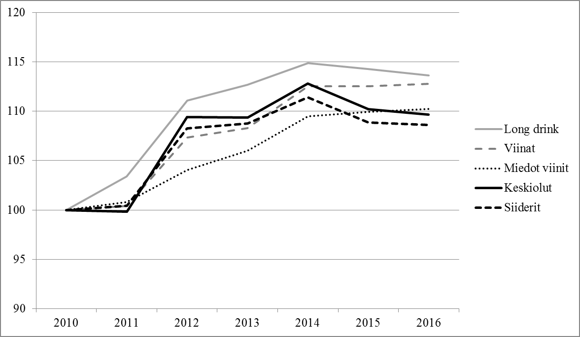 Kaikkien juomaryhmien 15 vuotta täyttänyttä asukasta kohden laskettu tilastoitu kulutus oli vuonna 2016 veronkorotuksia edeltänyttä vuoden 2007 tasoa alempana lukuun ottamatta long drink -juomia. Noin puolet tilastoidun kulutuksen laskusta johtuu väkevien alkoholijuomien kulutuksen vähenemisestä. Viime vuosina juomaryhmittäiset kulutustrendit ovat olleet suhteellisen vakaita. Väkevien kulutus on laskenut 2010-luvulla vuosittain keskimäärin runsaat neljä prosenttia. Viinin kulutus oli pitkään tasaisessa kasvussa, mutta on kääntynyt laskuun viime vuosina. Oluen kulutus on vähentynyt 2010-luvulla keskimäärin runsaan prosentin vuodessa ja siiderin kulutus keskimäärin yli kuusi prosenttia vuodessa. Myös long drink -juomien kulutus on kääntynyt keskimääräiseen noin kolmen prosentin vuosittaiseen laskuun 2010-luvulla. Siiderien ja long drink -juomien ryhmässä kulutuksen muutokset ovat prosentuaalisesti suurempia johtuen näiden juomaryhmien pienemmistä kulutusmääristä. Näiden juomaryhmien kulutuksen vähenemän merkitys jää suhteellisen pieneksi, noin viidesosaan, koko tilastoidun kulutuksen alenemasta 2010-luvulla.