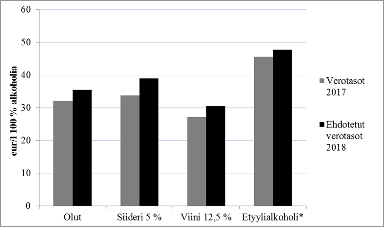 Ehdotettavan alkoholiveron korotuksen jälkeen etyylialkoholin valmistevero olisi 47,75 euroa litralta sataprosenttisena alkoholina laskettuna. Vastaavalla tavalla laskettuna välituotteissa, jotka sisältävät 22 tilavuusprosenttia alkoholia, veroa olisi 32,55 euroa litralta ja tyypillisessä 12,5 tilavuusprosenttia alkoholia sisältävässä viinissä 30,56 euroa litralta. Oluen vero litralta sataprosenttista alkoholia olisi ehdotettavan korotuksen jälkeen 35,45 euroa.