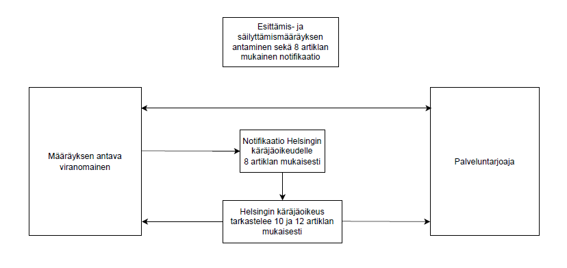 mukaan asetuksessa vahvistetaan säännöt, joiden nojalla jäsenvaltion viranomainen voi rikosoikeudellisessa menettelyssä antaa eurooppalaisen esittämismääräyksen tai eurooppalaisen säilyttämismääräyksen ja siten määrätä unionissa palveluja tarjoavan palveluntarjoajan, joka on sijoittautunut toiseen jäsenvaltioon tai, jos se ei ole sijoittautunut toiseen jäsenvaltioon, jota edustaa laillinen edustaja toisessa jäsenvaltiossa, esittämään tai säilyttämään sähköisiä todisteita tietojen sijainnista riippumatta.