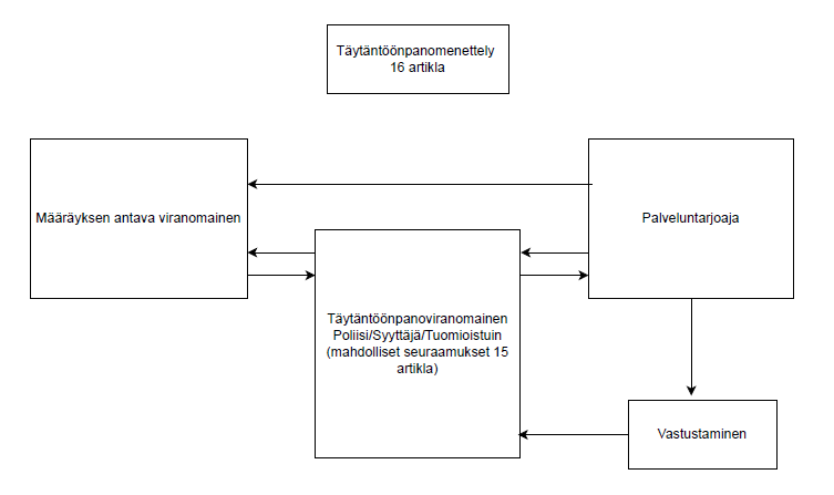 mukaan täytäntöönpanoviranomaisella tarkoitetaan täytäntöönpanovaltion viranomaista, joka mainitun valtion kansallisen lainsäädännön mukaisesti on toimivaltainen vastaanottamaan eurooppalaisen esittämismääräyksen ja esittämismääräystodistuksen tai eurooppalaisen säilyttämismääräyksen ja säilyttämismääräystodistuksen, jotka määräyksen antava viranomainen on toimittanut ilmoittamista tai täytäntöönpanoa varten asetuksen mukaisesti.