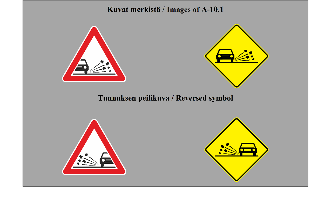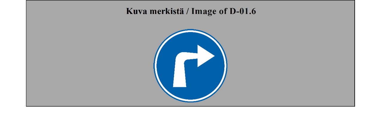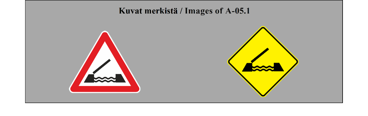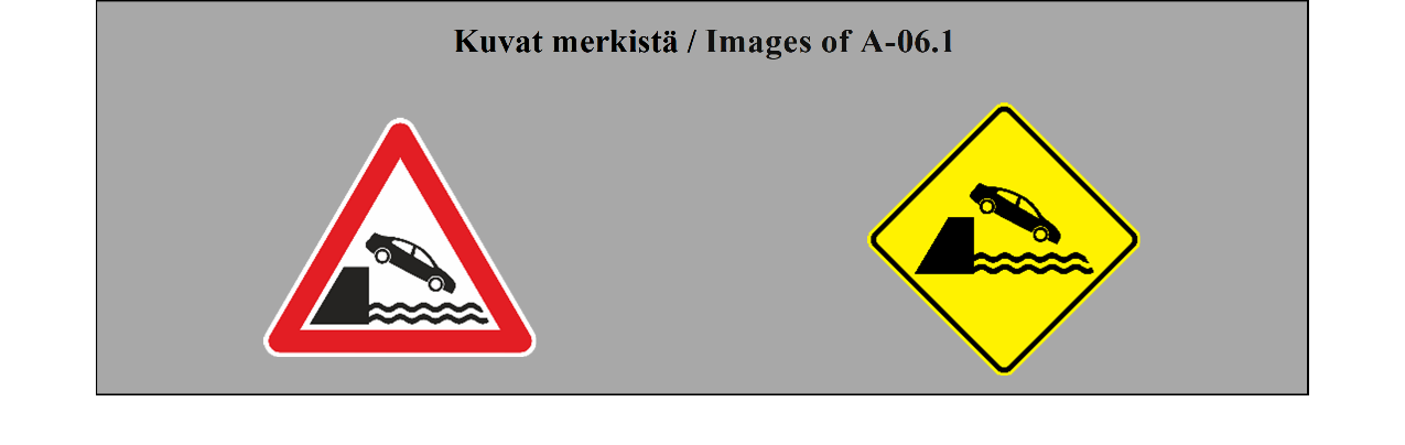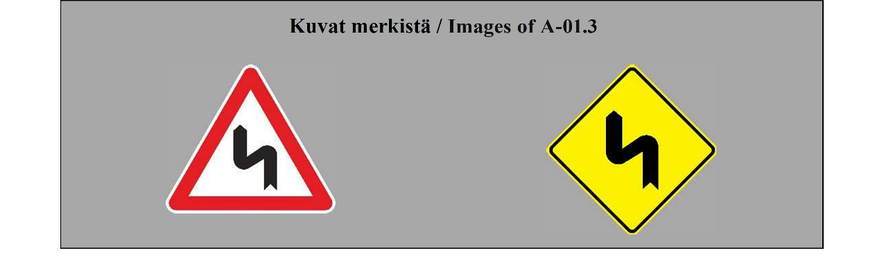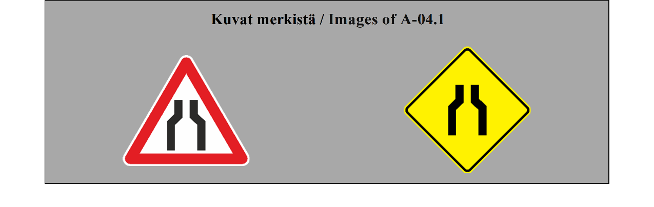 II luku LIIKENNEMERKIT 5 ARTIKLA 1. Tämän yleissopimuksen määrittelemässä järjestelmässä erotetaan seuraavat liikennemerkkilajit: (a) varoitusmerkit: näiden merkkien tarkoituksena on varoittaa tienkäyttäjiä tiellä olevasta vaarasta ja osoittaa heille sen laatu; (b) sääntelymerkit: näiden merkkien tarkoituksena on tiedottaa tienkäyttäjille erityisistä velvoitteista, rajoituksista tai kielloista, joita heidän on noudatettava; nämä merkit jaetaan (i) etuajo-oikeutta säänteleviin merkkeihin; (ii) kielto- ja rajoitusmerkkeihin; (iii) määräysmerkkeihin; (iv) sääntömerkkeihin; (c) tiedotusmerkit: näiden merkkien tarkoituksena on ohjata teillä liikkuvia tienkäyttäjiä tai antaa heille muita tarpeellisia tietoja; ne jakautuvat (i) opastuspisteiden ja palvelukohteiden opastusmerkkeihin; (ii) muihin opastusmerkkeihin: ennakkotiedotusmerkit; tienviitat; tien tunnistusmerkit; paikkakuntakilvet; varmennusmerkit; osoitusmerkit; (d) lisäkilvet: nämä muiden merkkien kanssa käytettävät merkit antavat lisätietoja. 2. Tämän yleissopimuksen salliessa valinnan mahdollisuuden useiden merkkien tai tunnusten välillä (a) sopimuspuolet sitoutuvat ottamaan käyttöön koko alueellaan ainoastaan yhden tällaisen merkin tai tunnuksen ja vain yhden tällaisen värin liitteessä 1 olevassa A osassa ja liitteessä 1 olevassa C osassa mainituille pysyville merkeille ja liitteessä 1 olevassa B osassa mainituille asiaan liittyville pysyville merkeille sekä vain yhden tällaisen värin väliaikaisille merkeille; (b) sopimuspuolten on pyrittävä tekemään alueellisia sopimuksia yhteisistä valinnoista; (c) tämän yleissopimuksen 3 artiklan 3 kohdan määräykset koskevat sellaisia merkki- ja tunnuslajeja, joita ei valita. | Chapter II ROAD SIGNS ARTICLE 5 1. The system prescribed in this Convention differentiates between the following classes of road signs: (a) Danger warning signs: these signs are intended to warn road users of a danger on the road and to inform them of its nature; (b) Regulatory signs: these signs are intended to inform road users of special obligations, restrictions or prohibitions with which they must comply; they are subdivided into: (i) Priority signs; (ii) Prohibitory and restrictive signs; (iii) Mandatory signs; (iv) Special regulation signs; (c) Informative signs: these signs are intended to guide road users while they are travelling or to provide them with other information which may be useful; they are subdivided into: (i) Information, facilities or service signs; (ii) Other information signs: Advance direction signs; Direction signs; Road identification signs; Place identification signs; Confirmatory signs; Indication signs; (d) Additional panels: these signs, only used with other signs, provide additional information. 2. Where this Convention allows a choice between several signs, several symbols, or several colours, (a) Contracting Parties undertake to adopt only one of such signs or symbols for the whole of their territories and only one of such colours for the permanent signs of Annex 1, section A and Annex 1, section C and the relevant permanent signs of Annex 1, section B for the whole of their territories and only one of such colours for the temporary signs for the whole of their territories; (b) Contracting Parties shall endeavour to reach regional agreements on the same choice; (c) The provisions of Article 3, paragraph 3, of this Convention shall apply to signs and symbols of the types which are not chosen. |