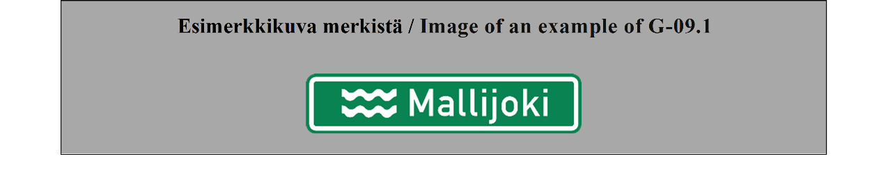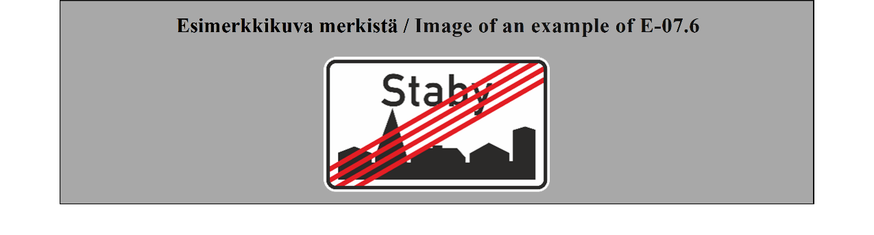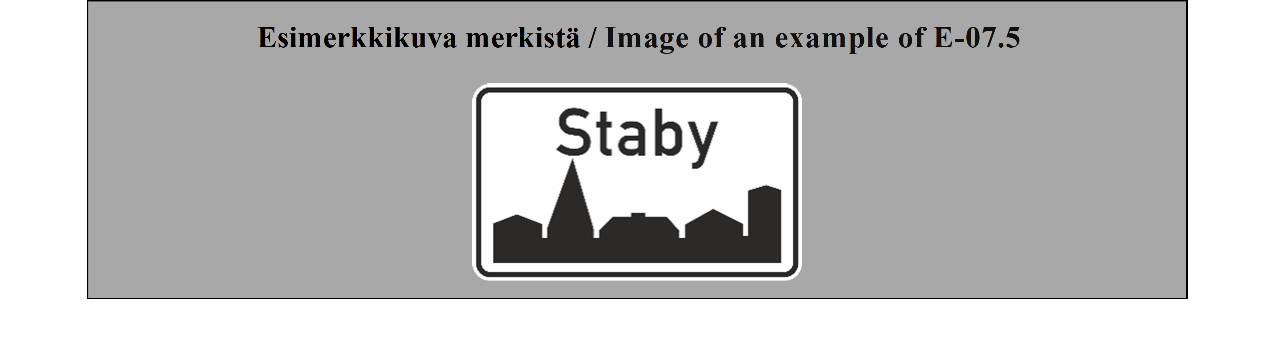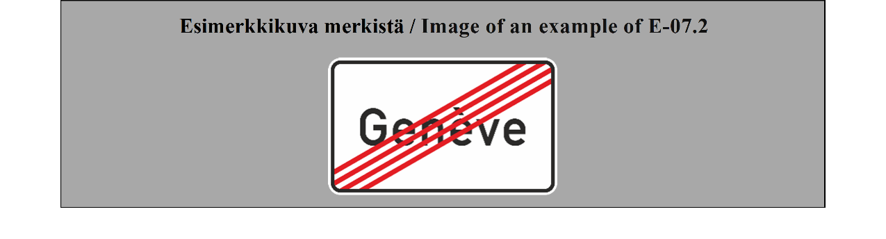 18 ARTIKLA Paikkakuntakilvet Paikkakuntakilpiä voidaan käyttää ilmaisemaan kahden valtion tai saman valtion kahden hallintoalueen välistä rajaa tai joen, solan, näköalapaikan tai muun sellaisen nimeä. Näiden merkkien on erottava selvästi merkeistä, jotka mainitaan liitteessä 1 olevan E osan II jakson 7 kohdassa (TAAJAMA ALKAA ja TAAJAMA PÄÄTTYY). | ARTICLE 18 Place identification signs Place identification signs may be used placed to show the frontier between two countries or the boundary between two administrative divisions of the same country or the name of a river, mountain pass, beauty spot, etc. These signs shall differ conspicuously from the signs referred to in Annex 1, section E, subsection II, paragraph 7 (BEGINNING OF A BUILT UP AREA and END OF A BUILT-UP AREA). |
