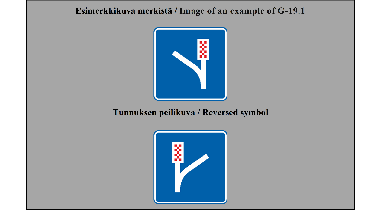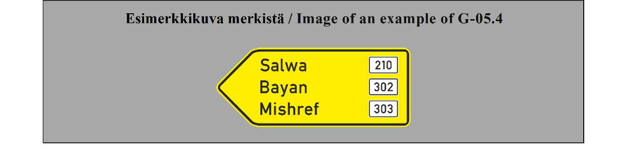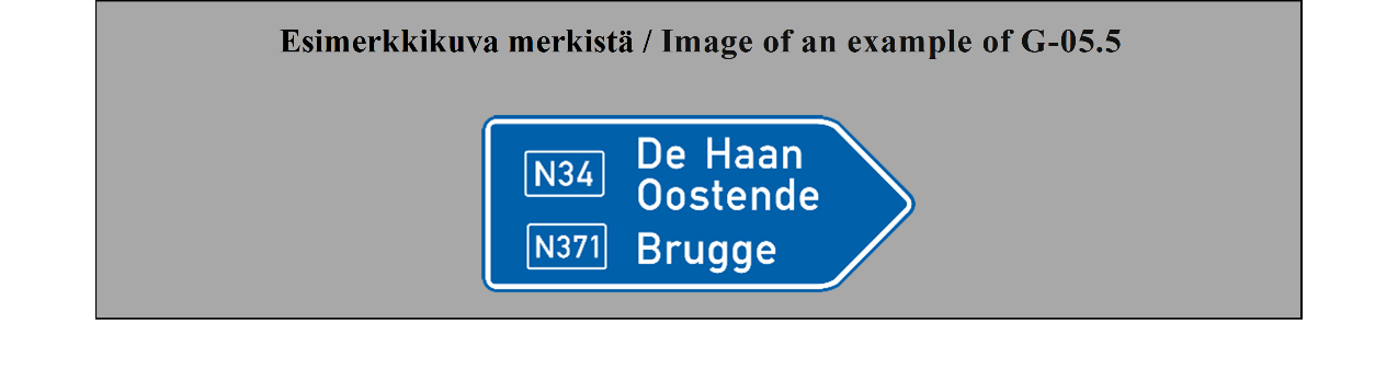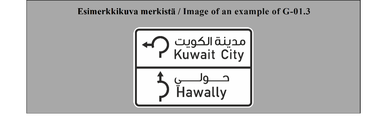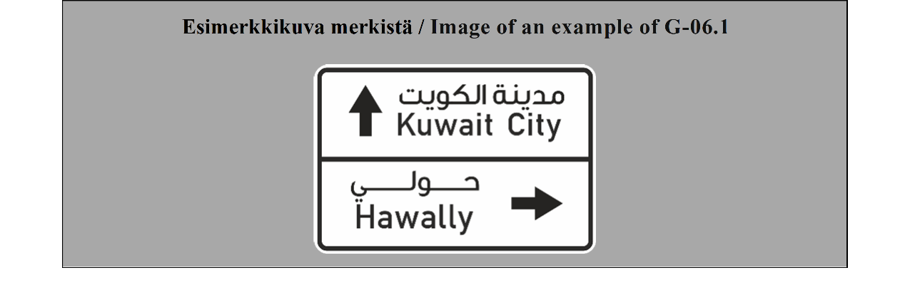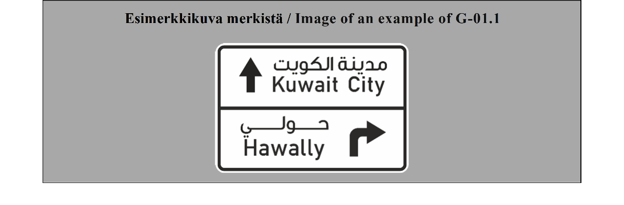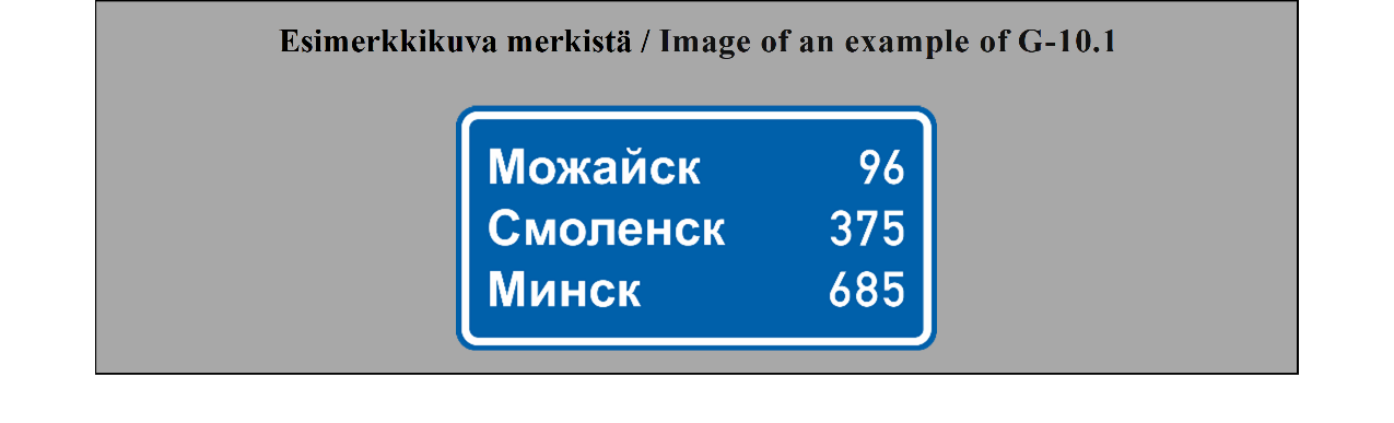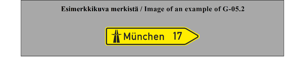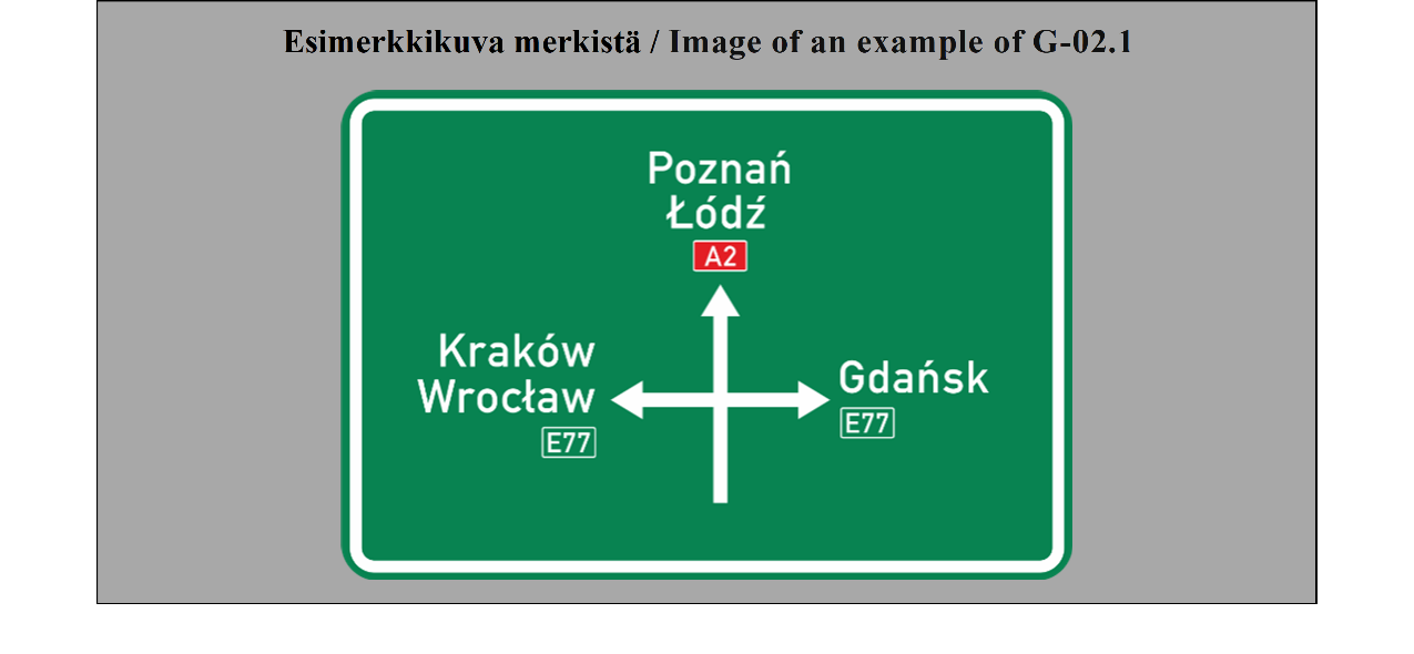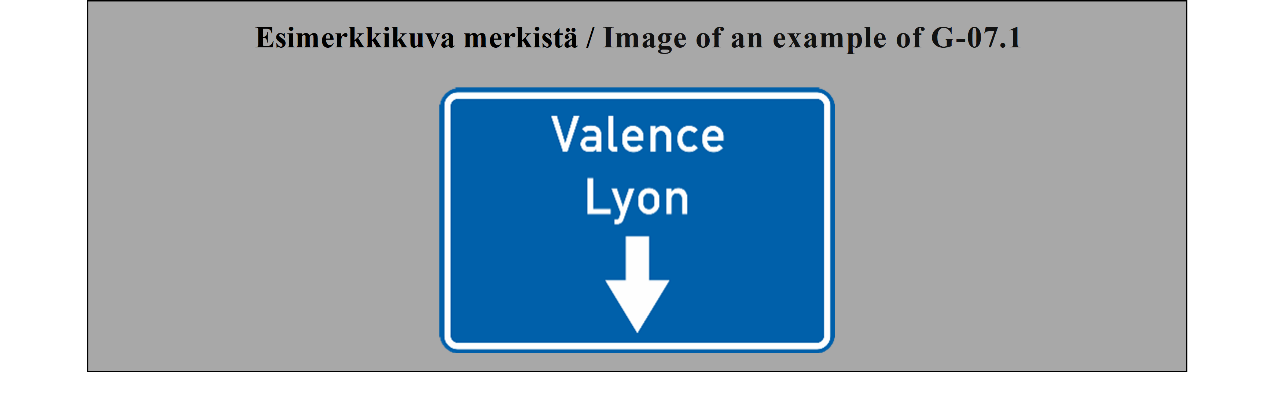 19 ARTIKLA Varmennusmerkit Varmennusmerkkejä käytetään, milloin toimivaltaiset viranomaiset katsovat sen tarpeelliseksi, varmentamaan tien suunta, esimerkiksi suurten taajamien ulosmenoteillä. | ARTICLE 19 Confirmatory signs Confirmatory signs are placed to confirm the direction of a road where the competent authorities consider it necessary, e.g. at the exit from a large built-up area. |