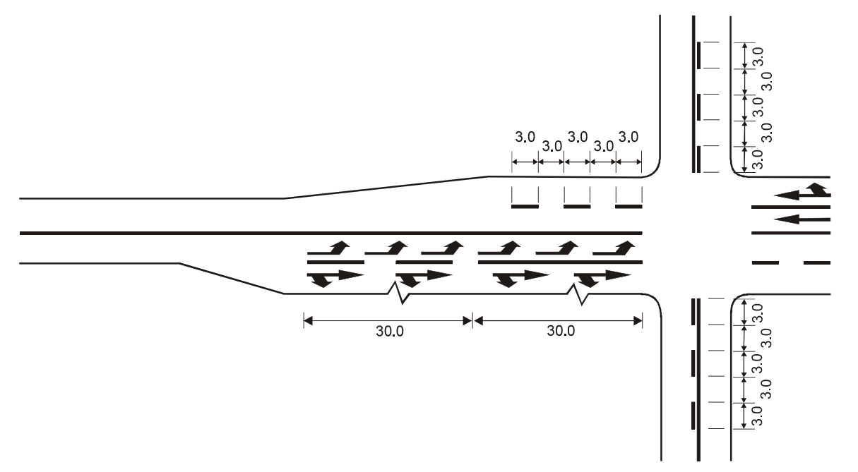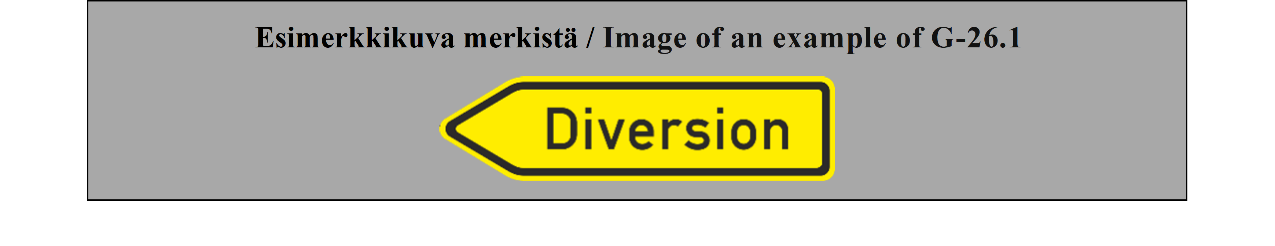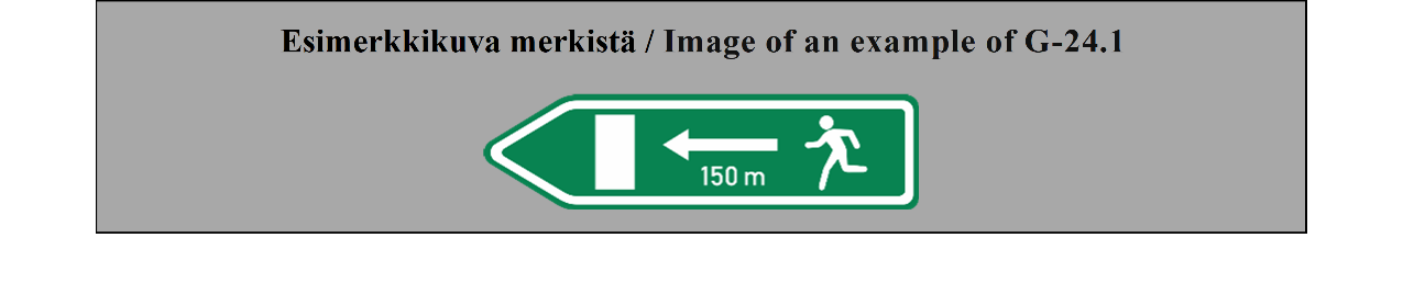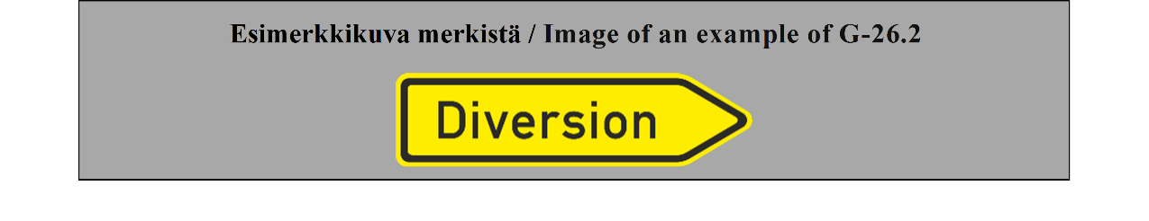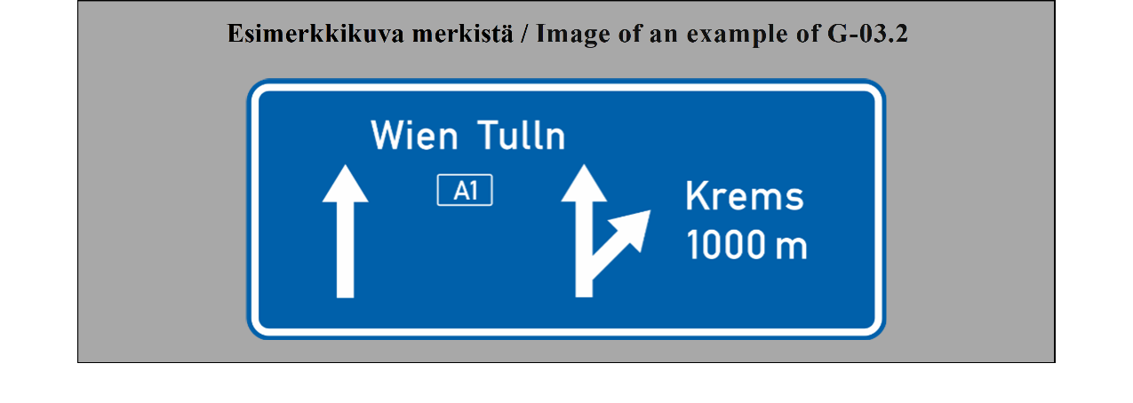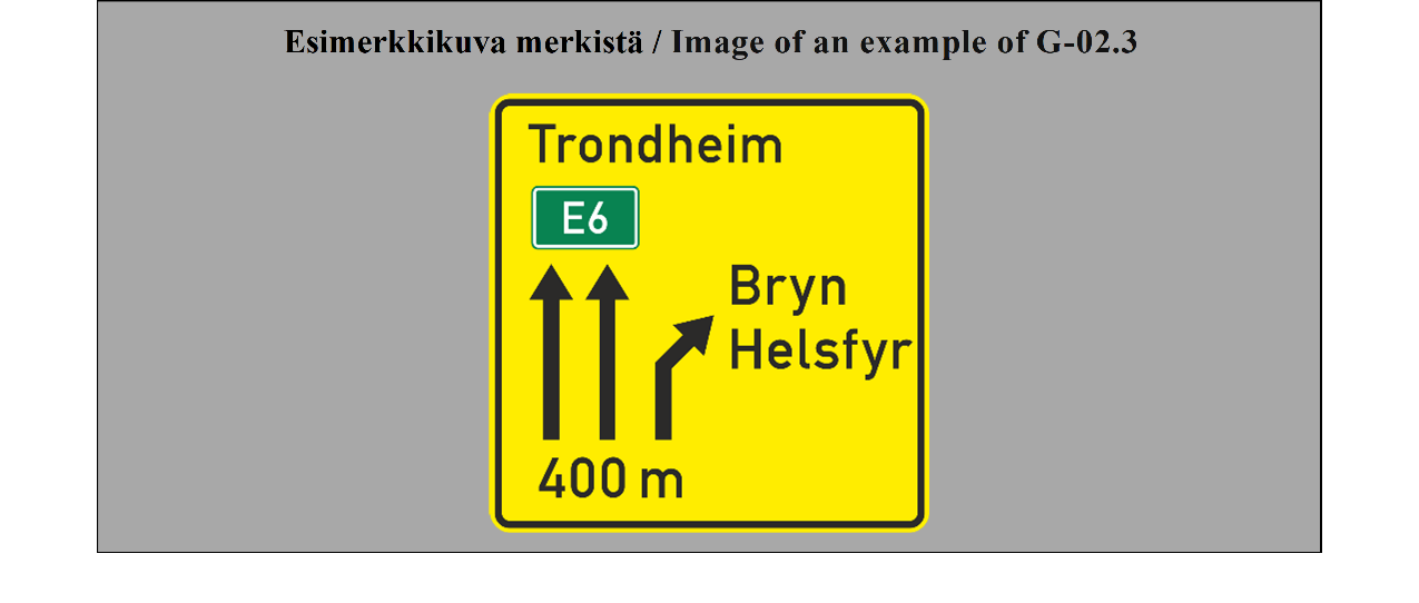 15 ARTIKLA Ennakkotiedotusmerkit Ennakkotiedotusmerkit on sijoitettava sellaiselle etäisyydelle risteyksestä, että ne ovat mahdollisimman tehokkaat sekä päivällä että yöllä, ja niiden sijoituksessa on otettava huomioon tie- ja liikenneolosuhteet, kuten ajoneuvojen tavanomainen nopeus ja liikennemerkin näkyvyysetäisyys; tämän etäisyyden ei tarvitse olla yli noin 50 metriä (55 jaardia) taajamissa, mutta sen on oltava vähintään 500 metriä (550 jaardia) moottoriteillä ja muilla nopealiikenteisillä teillä. Nämä merkit voidaan toistaa. | ARTICLE 15 Advance direction signs Advance direction signs shall be placed at such distance from the intersection as will make them most effective both by day and by night, having regard to road and traffic conditions, including the normal speed of vehicles and the distance at which the sign is visible; this distance need not exceed about 50 meters (55 yards) in built-up areas but shall be not less than 500 meters (550 yards) on motorways and other roads carrying fast traffic. The signs may be repeated. |