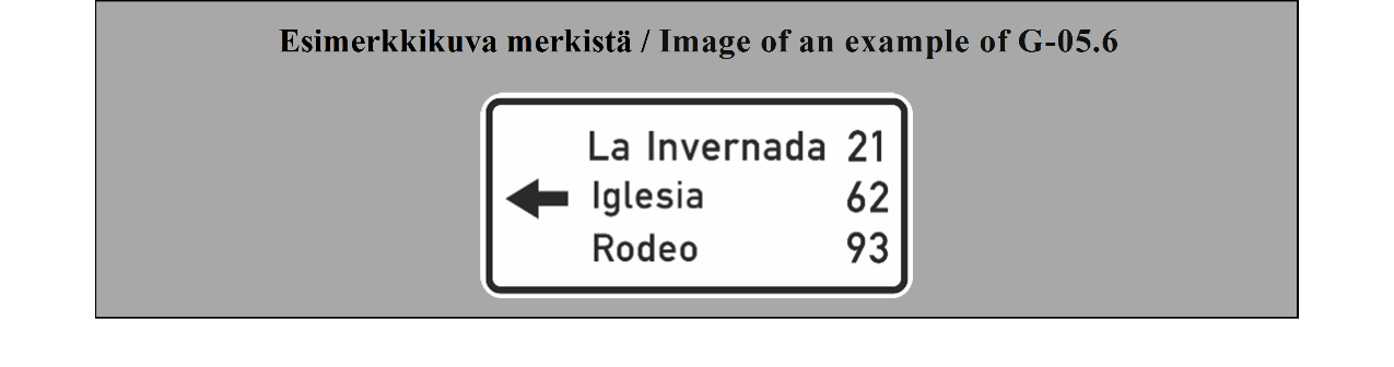 16 ARTIKLA Tienviitat 1. Tienviitat on sijoitettava lähelle risteystä tai risteykseen, ja niissä voi olla usean paikan nimet. | ARTICLE 16 Direction signs 1. Direction signs shall be placed near or at an intersection and may bear the names of several places of them. |