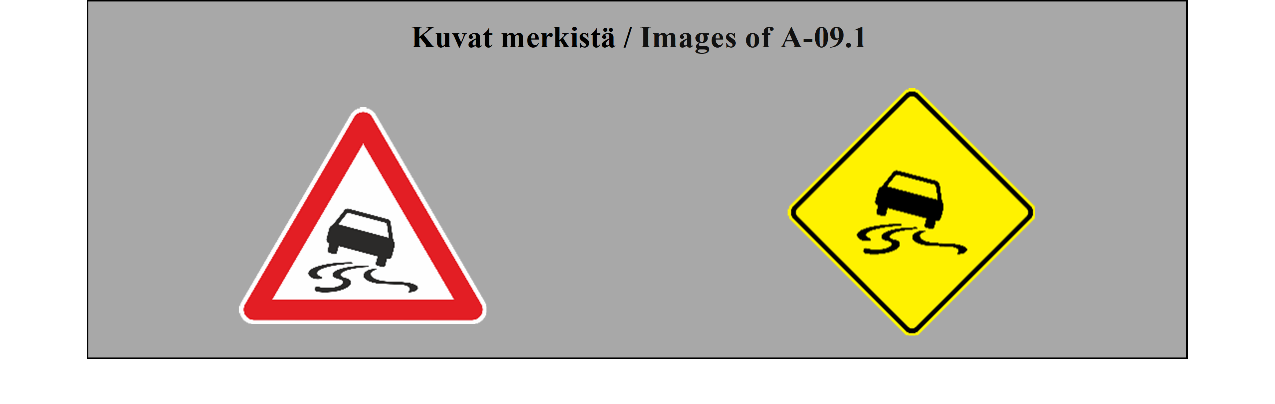 VAROITUSMERKIT 9 ARTIKLA 1. Tämän yleissopimuksen liitteessä 1 olevassa A osassa esitetään varoitusmerkkien mallit, kuvataan varoitusmerkit ja annetaan niiden merkitys. A osan II jaksossa esitetään näihin merkkeihin sijoitettavat tunnukset ja annetaan ohjeita merkkien käytöstä. Tämän yleissopimuksen 46 artiklan 2 kohdan mukaisesti on jokaisen valtion ilmoitettava pääsihteerille, onko se valinnut mallin 1 (tasasivuinen kolmio) vai mallin 2 (neliö, jonka yksi halkaisija on pystysuuntainen) mukaiset varoitusmerkit käyttöönsä. 2. Varoitusmerkkien lukumäärää ei saa lisätä tarpeettomasti, vaan ne on sijoitettava siten, että ne varoittavat tiellä mahdollisesti olevista vaarallisista paikoista, joita tarpeellista varovaisuutta noudattavan kuljettajan on vaikea havaita ajoissa. 3. Varoitusmerkit on sijoitettava sellaisen välimatkan päähän vaarakohdasta, että ne ovat mahdollisimman tehokkaita niin päivällä kuin yölläkin ottaen huomioon tie- ja liikenneolosuhteet, kuten ajoneuvojen tavanomaisen nopeuden sekä liikennemerkin havaitsemisetäisyyden. 4. Liikennemerkin ja vaarallisen tieosuuden alkamiskohdan välimatka on ilmoitettava, jos kuljettajien on mahdotonta arvioida merkin ja vaarallisen tieosuuden alkamiskohdan välistä etäisyyttä tai jos tämä etäisyys poikkeaa tavanomaisesti odotettavissa olevasta. Tämä välimatka on ilmaistava liitteessä 1 olevan H osan II jakson 1 kohdan (ETÄISYYS-LISÄKILPI) mukaisesti. 5. Varoitusmerkit voidaan toistaa etenkin moottoriteillä tai muilla teillä, joihin sovelletaan moottoriteitä koskevia määräyksiä. Missä merkit on toistettu, on niiden ja vaarallisen tieosuuden alkamiskohdan välinen etäisyys ilmaistava tämän artiklan 4 kohdan määräysten mukaisesti. Kuitenkin jos kyseessä ovat tasoristeyksistä ja avattavista silloista varoittavat ja etäisyyden niihin ilmoittavat merkit, sopimuspuolet voivat käyttää erityisiä tasoristeysten ja avattavien siltojen merkkejä, jotka on kuvattu liitteessä 1 olevan A osan II jakson 27 kohdassa (TASORISTEYSTEN TAI AVATTAVIEN SILTOJEN LÄHESTYMINEN). 6. Jos varoitusmerkkiä käytetään ilmoittamaan tietyn pituisesta vaarallisesta tieosuudesta (esimerkiksi sarjasta vaarallisia mutkia tai huonokuntoisesta ajoradan osasta) ja jos katsotaan tarpeelliseksi ilmaista tämän osuuden pituus, se on tehtävä tämän yleissopimuksen liitteessä 1 olevan H osan II jakson 1 kohdan (PITUUDEN OSOITTAVA LISÄKILPI) mukaisesti. | DANGER WARNING SIGNS ARTICLE 9 1. Section A of Annex 1 to this Convention provides the models for danger warning signs, describes the danger warning signs and gives their meaning. Section A, subsection II indicates the symbols to be placed on these signs and gives some instructions for their use. In conformity with Article 46, paragraph 2 of this Convention, each State shall notify the Secretary-General whether it has selected model one (equilateral triangle) or model two (square with one diagonal vertical) for danger warning signs. 2. The number of danger warning signs shall not be increased unnecessarily, but such signs shall be sited to give warning of possible road hazards which are difficult for a driver proceeding with due caution to perceive in time. 3. Danger warning signs shall be placed at such distance from the danger point as will make them most effective both by day and by night, having regard to road and traffic conditions, including the normal speed of vehicles and the distance at which the sign is visible. 4. The distance between the sign and the beginning of a dangerous section of road shall be given when the distance between the sign and the beginning of the dangerous section of road cannot be judged by drivers or is not what they might normally expect. This distance shall be shown in accordance with Annex 1, section H, subsection II, paragraph 1 (DISTANCE PANEL). 5. Danger warning signs may be repeated, particularly on motorways and roads treated as motorways. Where they are repeated, the distance between the sign and the beginning of the dangerous section of road shall be shown in accordance with the provisions of paragraph 4 of this Article. However, with respect to danger warning signs giving warning of and distance to level crossings and opening bridges, Contracting Parties may use signs specific for approaches to level crossings and opening bridges, which are described in Annex 1, section A, subsection II, paragraph 27 (APPROACHES TO LEVEL CROSSINGS OR OPENING BRIDGES). 6. If a danger warning sign is used to give warning of a danger on a section of road of some length (e.g. a series of dangerous bends or a section of carriageway in bad condition) and if it is considered desirable to show the length of that section, this shall be done in accordance with Annex l, section H, subsection II, paragraph 1 (LENGTH INDICATION PANEL. |
