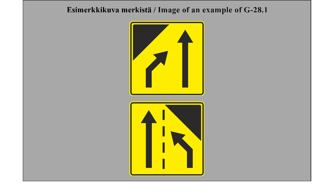 28 ARTIKLA 1. Muita ajoradan pinnassa olevia merkintöjä, kuten nuolia, yhdensuuntaisia tai vinoviivoja tai tekstejä, voidaan käyttää liikennemerkeillä annettujen ohjeiden toistamiseen tai antamaan tienkäyttäjille ohjeita, joita ei voida liikennemerkein sopivalla tavalla ilmaista. Tällaisia merkintöjä on käytettävä etenkin osoittamaan pysäköintialueiden tai -kaistojen rajoja tai merkitsemään linja- tai johdinautopysäkkejä, joilla pysäköiminen on kielletty, sekä osoittamaan ennen risteystä tapahtuvaa kaistojen ennakkovalintaa. Kuitenkin jos ajoradalla, joka on jaettu ajokaistoihin pitkittäisin tiemerkinnöin, on nuoli, kuljettajien on seurattava käyttämälleen kaistalle nuolella osoitettua suuntaa tai jotakin sille nuolilla osoitetuista suunnista. 2. Jollei tämän yleissopimuksen 27 artiklan 4 kohdan suojateitä koskevissa määräyksissä muuta määrätä, tarkoittaa ajoradan osan tai hieman sen yläpuolelle kohoavan alueen merkitseminen yhdensuuntaisilla vinoviivoilla yhtenäisen tai katkoviivan ympäröimänä, etteivät ajoneuvot saa tulla yhtenäisen viivan ympäröimälle alueelle ja että katkoviivan ympäröimälle alueelle ajoneuvot saavat tulla vain, jos on nähtävissä, että se voi tapahtua vaaratta, tai kääntyäkseen ajoradan vastakkaiselle puolelle liittyvälle tielle. 3. Ajoradan reunassa oleva sik-sak-viiva osoittaa, että pysäköinti kyseisellä puolella ajorataa on kielletty viivan osoittamalla tavalla. Tällaista viivaa mahdollisesti yhdessä sanan BUS tai kirjaimen A kanssa voidaan käyttää merkitsemään linja-auton tai johdinauton pysäkkiä. | ARTICLE 28 1. Other markings on the carriageway, such as arrows, parallel or oblique stripes, or inscriptions, may be used to repeat the instructions given by signs or to give road users information which cannot be suitably conveyed by signs. Such markings shall be used, in particular, to show the boundaries of parking zones or strips, to mark bus or trolleybus stops where parking is prohibited, and for pre-selection before intersections. However, if there is an arrow on the carriageway where it is divided into traffic lanes by means of longitudinal markings, drivers shall follow the direction or one of the directions indicated in the lane along which they are travelling. 2. Subject to the provisions of Article 27, paragraph 4 of this Convention which relate to pedestrian crossings, the marking of part of the carriageway or of an area raised slightly above the level of the carriageway by parallel oblique stripes framed by a continuous line, or by broken lines, shall, in the case of areas framed by a continuous line, mean that vehicles must not enter that area, and in the case of areas framed by broken lines, that vehicles shall not enter that area unless it can be seen that it is safe to do so or in order to turn into a joining road on the opposite side of the carriageway. 3. A zigzag line at the side of the carriageway shall mean that parking on that side of the carriageway is prohibited as far as the line extends. Such line possibly together with the word "BUS" or with the letter "A" may be used to indicate a bus or trolleybus stop. |