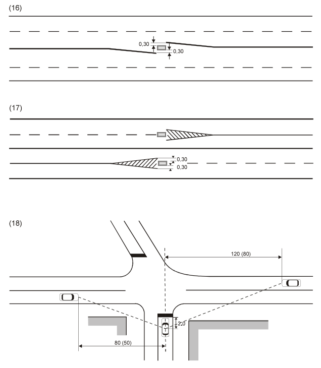 27 ARTIKLA 1. Yhtenäisen viivan muodostama poikittainen merkintä, joka kulkee yhden tai useamman ajokaistan yli, osoittaa linjaa, jonka taakse tämän yleissopimuksen liitteessä 1 olevan B osan 2 kohdassa kuvattu merkki (STOP) velvoittaa kuljettajat pysähtymään. Tällaista merkintää voidaan myös käyttää osoittamaan linjaa, jonka taakse kuljettajien on pysähdyttävä liikennevalon johdosta tai liikennettä ohjaavan viranomaisen antaman merkin vuoksi tai ennen tasoristeystä. Teksti STOP voidaan merkitä ajorataan ennen liitteessä 1 olevan B osan 2 kohdassa kuvatun merkin (STOP) yhteydessä käytettäviä merkintöjä. 2. Ellei se ole teknisesti mahdotonta, on tämän artiklan 1 kohdan mukainen poikittainen merkintä sijoitettava kaikkialle, mihin on asetettu liitteessä 1 olevan B osan 2 kohdassa kuvattu merkki (STOP). 3. Katkoviivan muodostama poikittainen merkintä, joka kulkee yhden tai useamman ajokaistan yli, osoittaa linjan, jota ajoneuvot eivät saa yleensä ylittää täyttäessään väistämisvelvollisuuttaan liitteessä 1 olevan B osan 1 kohdassa kuvatun merkin (VÄISTÄ) johdosta. Ennen tällaista merkintää voidaan ajorataan merkitä leveäreunainen kolmio, jonka yksi sivu on merkinnän suuntainen ja tämän sivun vastainen kärki lähestyviä ajoneuvoja kohti osoittava. 4. Suojateiden merkintään on käytettävä melko leveitä, ajoradan akselin suuntaisia raitoja. 5.Risteävien pyöräteiden merkitsemiseen on käytettävä joko poikittaisia viivoja tai muita merkkejä, joita ei voida sekoittaa suojateiden merkintöihin. | ARTICLE 27 1. A transverse marking consisting of a continuous line across one or more traffic lanes shall mark the line behind which drivers are required by the sign described in Annex 1, section B, paragraph 2 (STOP) to stop. Such a marking may also be used to show the line behind which drivers may be required to stop by a light signal, or by a signal given by an authorized official directing traffic, or before a level crossing. The "STOP" inscription may be marked on the carriageway in advance of the markings accompanying the sign described in Annex 1, section B, paragraph 2 (STOP). 2. Unless this is technically impossible, the transverse marking described in paragraph l of this Article shall be placed on the carriageway wherever a sign B, 2 described in Annex 1, section B, paragraph 2 (STOP), is set up. 3. A transverse marking consisting of a broken line across one or more traffic lanes shall show the line which vehicles may not normally pass when giving way in compliance with the sign described in Annex 1, section B, paragraph 1 (GIVE WAY). In advance of such a marking, a triangle with broad sides, having one side parallel to the marking and the opposite vertex pointing towards approaching vehicles, may be marked on the carriageway to symbolize this sign. 4. To mark pedestrian crossings, relatively broad stripes, parallel to the axis of the carriageway, shall be used. 5. To mark cyclist crossings, either transverse lines, or other markings which cannot be confused with those of pedestrian crossings, shall be used. |
