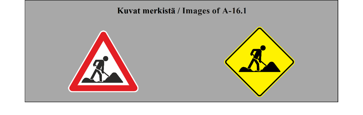 V luku ERINÄISIÄ MÄÄRÄYKSIÄ 31 ARTIKLA Tietyöt 1. Ajoradalla olevien tietöiden rajat on selvästi merkittävä. 2. Jos tietyön laajuus ja liikenteen tiheys tekevät sen aiheelliseksi, tietyön rajat on merkittävä pystyttämällä niille yhtenäinen este tai erillisiä esteitä, joihin on maalattu punavalkoiset, punakeltaiset, mustavalkoiset tai mustakeltaiset raidat, sekä lisäksi asennettava niihin yöksi valot tai heijastimet, elleivät esteet ole heijastavia. Tähän tarkoitukseen käytettyjen heijastinlaitteiden ja vilkkumattomien valojen on oltava punaisia tai tummankeltaisia ja vilkkuvien valojen tummankeltaisia. Kuitenkin a) vain tiettyyn suuntaan kulkevalle liikenteelle näkyvät valot ja laitteet, jotka osoittavat liikenteen kulkusuunnan vastaisella puolella olevia tietyön rajoja, voivat olla valkoisia; b) valot tai laitteet, jotka osoittavat liikennesuunnat erottavan tietyön rajat, voivat olla valkoisia tai vaaleankeltaisia. | Chapter V MISCELLANEOUS ARTICLE 31 Road works 1. The limits of road works on the carriageway shall be clearly shown. 2. Where the extent of the road works and the volume of traffic justify it, the limits of the works shall be marked by setting up continuous or discontinuous barriers painted with alternate red and white, red and yellow, black and white, or black and yellow stripes, and in addition, at night, if the barriers are not reflectorized, by lights and reflecting devices. Reflecting devices and fixed lights used for this purpose shall be red or dark yellow and flashing lights shall be dark yellow. However: (a) Lights and devices visible only to traffic moving in one direction and marking the limits of road works on the opposite side of the road from that traffic may be white; (b) Lights and devices marking the limits of road works separating the two directions of traffic may be white or light yellow. |