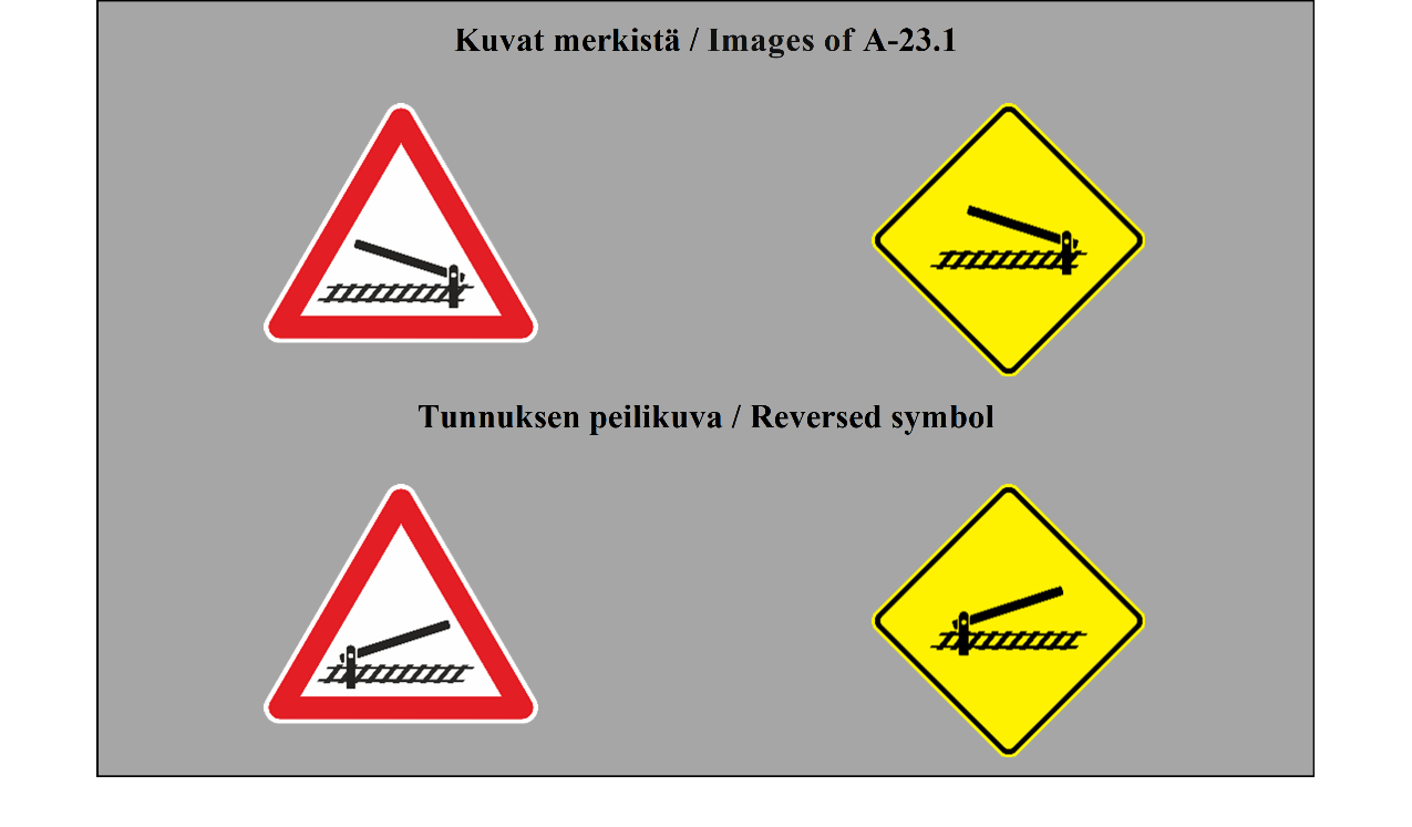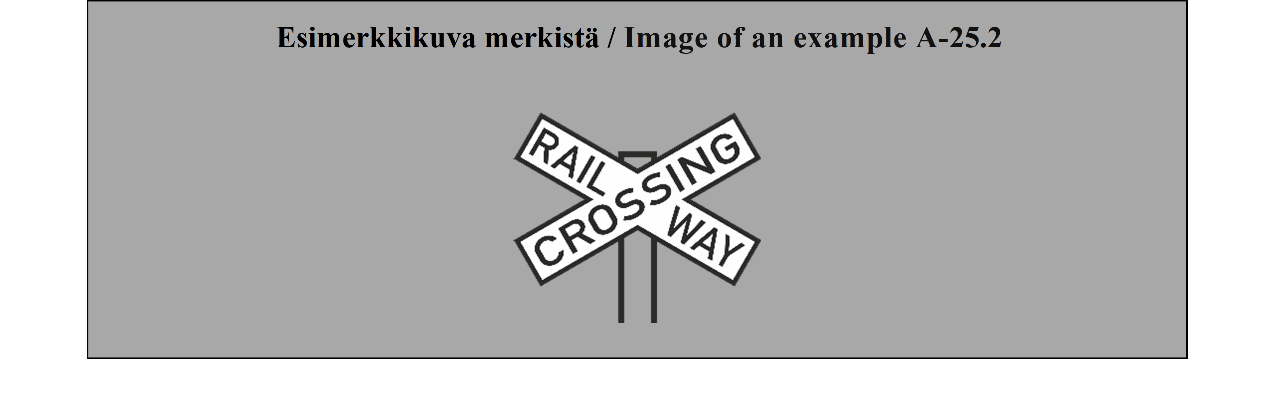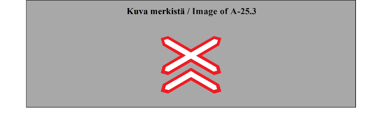 35 ARTIKLA 1. Tasoristeyksissä olevat puomit ja puolipuomit on merkittävä selvästi maalaamalla niihin punavalkoiset, punakeltaiset, mustavalkoiset tai mustakeltaiset raidat. Ne voidaan kuitenkin maalata kokonaan valkoisiksi tai keltaisiksi, jos niiden keskelle asetetaan suuri punainen pyöreä levy. 2. Kaikissa puomeja tai puolipuomeja vailla olevissa tasoristeyksissä on oltava rautatielinjan välittömässä läheisyydessä liitteessä 1 olevan A osan II jakson 24 kohdassa kuvattu merkki (MUU TASORISTEYS). Jos tasoristeyksessä on junien lähestymisestä varoittava liikennevalo tai liitteessä 1 olevan B osan 2 kohdassa kuvattu merkki (STOP), merkki TASORISTEYS on sijoitettava samaan kannattimeen kuin liikennevalo tai merkki STOP. Merkin TASORISTEYS sijoittaminen ei ole pakollista (a) tien ja rautatien muodostamiin risteyksiin, joissa rautatieliikenne etenee hyvin hitaasti ja joissa rautatievirkailija ohjaa liikennettä tarpeellisin käsimerkein; eikä (b) rautatien ja polun tai erittäin vähäliikenteisen tilustien risteykseen. | ARTICLE 35 1. The gates and half-gates of level crossings shall be clearly marked in alternate stripes of red and white, red and yellow, black and white, or black and yellow. They may, however, be coloured white or yellow only, provided that a large red disc is displayed at the centre. 2. At all level crossings which have neither gates nor half-gates there shall be placed, in the immediate vicinity of the railway, the sign described in Annex 1, section A, subsection II, paragraph 24 (OTHER LEVEL CROSSINGS). If there is a light signal giving warning of the approach of trains or sign described in Annex 1, section B, paragraph 2 (STOP), LEVEL CROSSINGS sign shall be placed on the same support as the light signal or STOP sign. Placing of LEVEL CROSSINGS sign is not mandatory at: (a) An intersection between a road and a railway at which rail traffic proceeds very slowly and road traffic is regulated by a railway officer making the necessary hand signals; or (b) An intersection between a railway and either an earth-track (dirt road) where traffic is very light, or a footpath. |