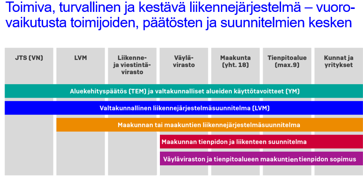 Tienpidon sopimuksessa tulisivat toisaalta lisäksi huomioiduiksi tienpidon valtakunnalliset toimintalinjat, maakuntien tienpidon ja liikenteen suunnitelmat sekä valtion talousarvio, jotka vaikuttavat rahoituskysymyksiin. Samoin rahoituskysymyksiin ja tienpidon sopimukseen vaikuttaisivat liikenne- ja viestintäministeriön Väylävirastoon tulosohjausprosessissa kohdistamat tavoitteet, joilla valtakunnallisen liikennepolitiikan sekä erityisesti valtakunnallisen liikennejärjestelmäsuunnitelman tavoitteita voitaisiin osaltaan viedä käytäntöön.