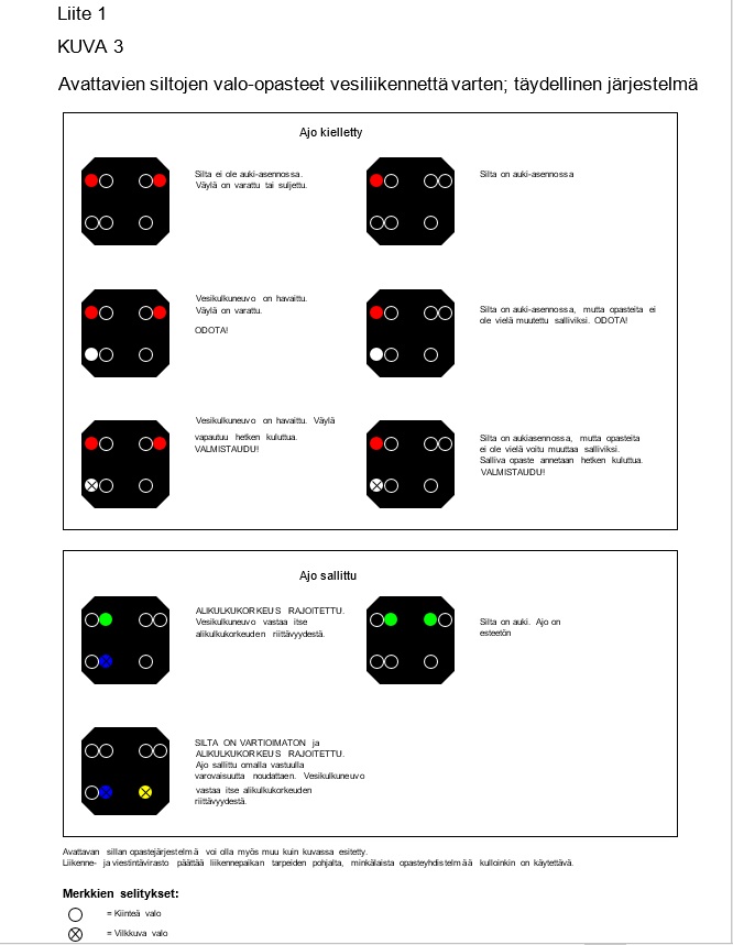 Vesiliikennelain 56 § sisältää vesiliikennemerkkien sijoittamista ja ulkoasua koskevat säännökset. Pykälän 4 momentin mukaan Liikenne- ja viestintävirastolla on oikeus antaa tarkempia määräyksiä vesiliikennemerkkien ja valo-opasteiden sijoituksesta, väreistä, rakenteesta ja mitoituksesta, mutta sillä ei ole toimivaltaa antaa määräyksiä käytettävistä valo-opasteyhdistelmistä. Nykyisin on käytössä monenlaisia valo-opasteyhdistelmiä. Tämä voi aiheuttaa valo-opasteiden väärin tulkintaa ja vaarantaa liikenneturvallisuutta.