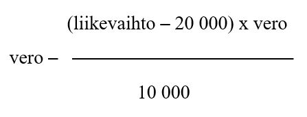 Verovelvollinen, jonka tilikauden liikevaihto (kaavassa liikevaihto) ylittää 20 000 euroa, saa tilikaudelta tilitettävästä verosta (kaavassa vero) huojennuksen, jonka suuruus määräytyy seuraavasti: