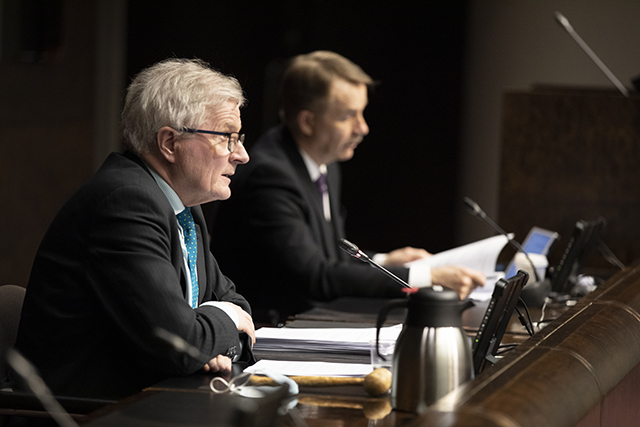 Finansutskottets ordförande Johannes Koskinen (sd) och vice ordförande Arto Pirttilahti (cent) höll presskonferens via Teams.