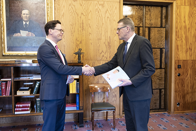 Jämställdhetsombudsmannen Jukka Maarianvaara överlämnade sin berättelse till riksdagens talman Matti Vanhanen.