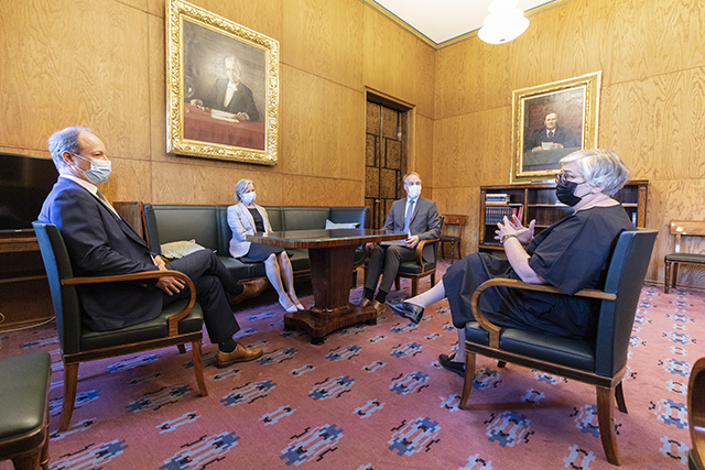 På bilden från vänster justitieombudsman Jääskeläinen, biträdande justitieombudsman Maija Sakslin, biträdande justitieombudsman Pasi Pölonen och talman Anu Vehviläinen.