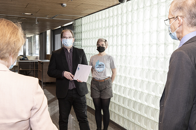 Harri Hölttä och Paloma Hannonen överlämnade medborgarinitiativet till riksdagens lagstiftningsdirektör Tuula Kulovesi. På bilden även riksdagens biträdande generalsekreterare Timo Tuovinen.