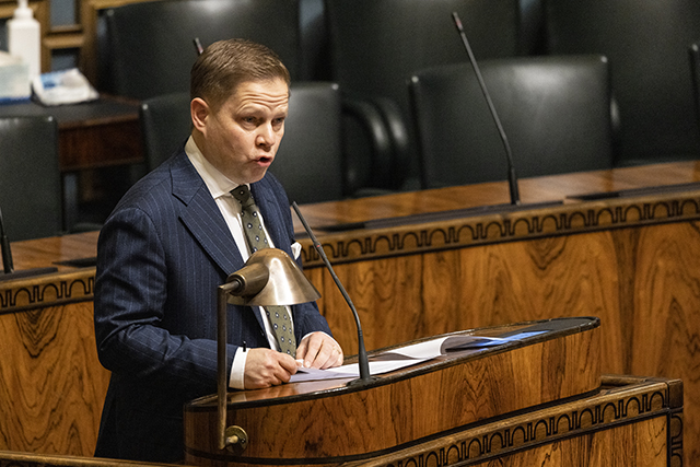 Social- och hälsovårdsutskottets ordförande Markus Lohi (cent) presenterade utskottets betänkande i plenum. Arkivbild.