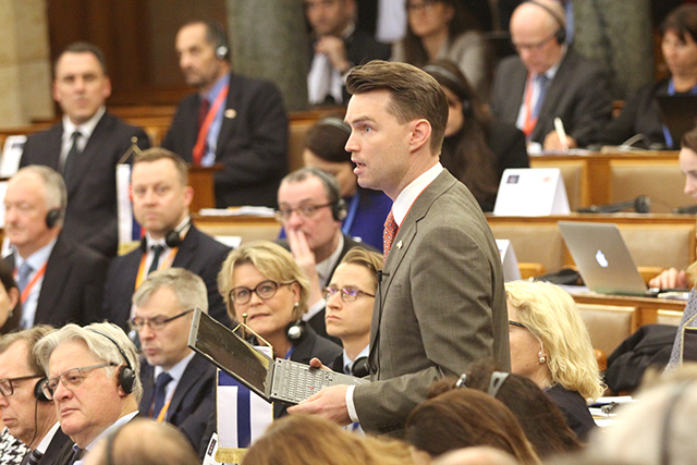 ​Stora utskottets ordförande Heikki Autto vid Cosacplenarmötet i Ungerns parlament den 28.10.2024.