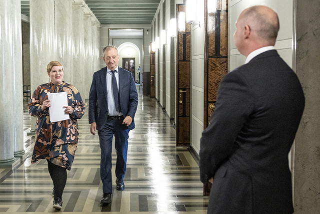 Annika Saarikko (cent) och Harry Harkimo (liik) lämnade interpellationen till centralkansliet torsdagen den 28 september 2023.