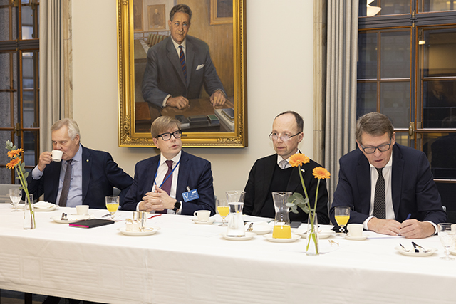 ​Vice talman Antti Rinne, Utrikesministeriets statssekreterare Jukka Salovaara, utrikesutskottets ordförande Jussi Halla-aho och talman Matti Vanhanen under forumets möte.