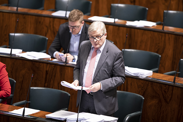 Finansutskottets ordförande Johannes Koskinen (sd) presenterade utskottets betänkande i plenum.