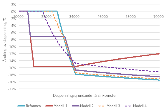 På basis av en bedömning utifrån Folkpensionsanstaltens registermaterial från år 2023 påverkar ändringarna av beräkningsformeln årligen omkring 193 000 mottagare av egentlig sjukdagpenning, av vilka uppskattningsvis 80 000 (41 %) är män och 113 000 (59 %) är kvinnor. Räknat utifrån materialet från år 2023, med beaktande av alla utbetalda sjukdagpenningar, uppskattas att den genomsnittliga sjukdagpenningen minskar med 6,33 euro per dag, med 7,45 euro per dag för män och med 5,45, euro per dag för kvinnor. Bland dem som påverkas av ändringen, det vill säga personer som tjänar 27 633 euro eller mer, minskar dagpenningen mer än i genomsnitt, det vill säga med omkring 12,51 euro per dag, med 13,61 euro per dag för män och med 11,51 euro per dag för kvinnor.