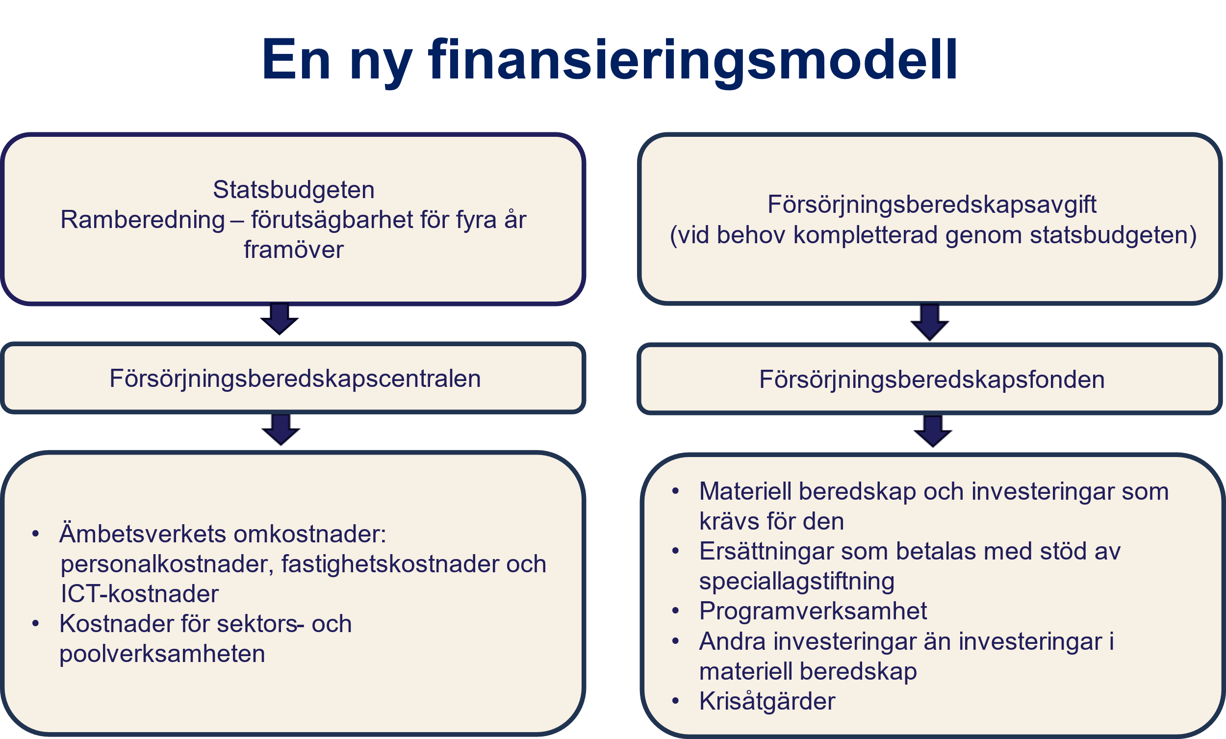 Ansvaret för försörjningsberedskapen ska enligt förslaget även omfatta behövliga utvecklingsåtgärder. Försörjningsberedskapen utgör en del av den övergripande säkerheten. I säkerhetsstrategin för samhället (2025:2), som utfärdats i form av ett principbeslut av statsrådet, fastställs de olika ministeriernas strategiska uppgifter och ansvar. I säkerhetsstrategin för samhället beskrivs en verksamhetsmodell för den övergripande säkerheten där myndigheter, näringslivet, organisationer och invånarna tillsammans sörjer för samhällets vitala funktioner. Syftet med strategin som godkänts som statsrådets principbeslut är att ge alla ministerier en gemensam referensram som de kan använda för att sörja för den övergripande säkerheten utifrån sina egna utgångspunkter. Den sektorsspecifika lagstiftning som gäller ministeriernas ansvarsområden innehåller också ofta förpliktande ansvar i anslutning till försörjningsberedskap eller materiell beredskap.